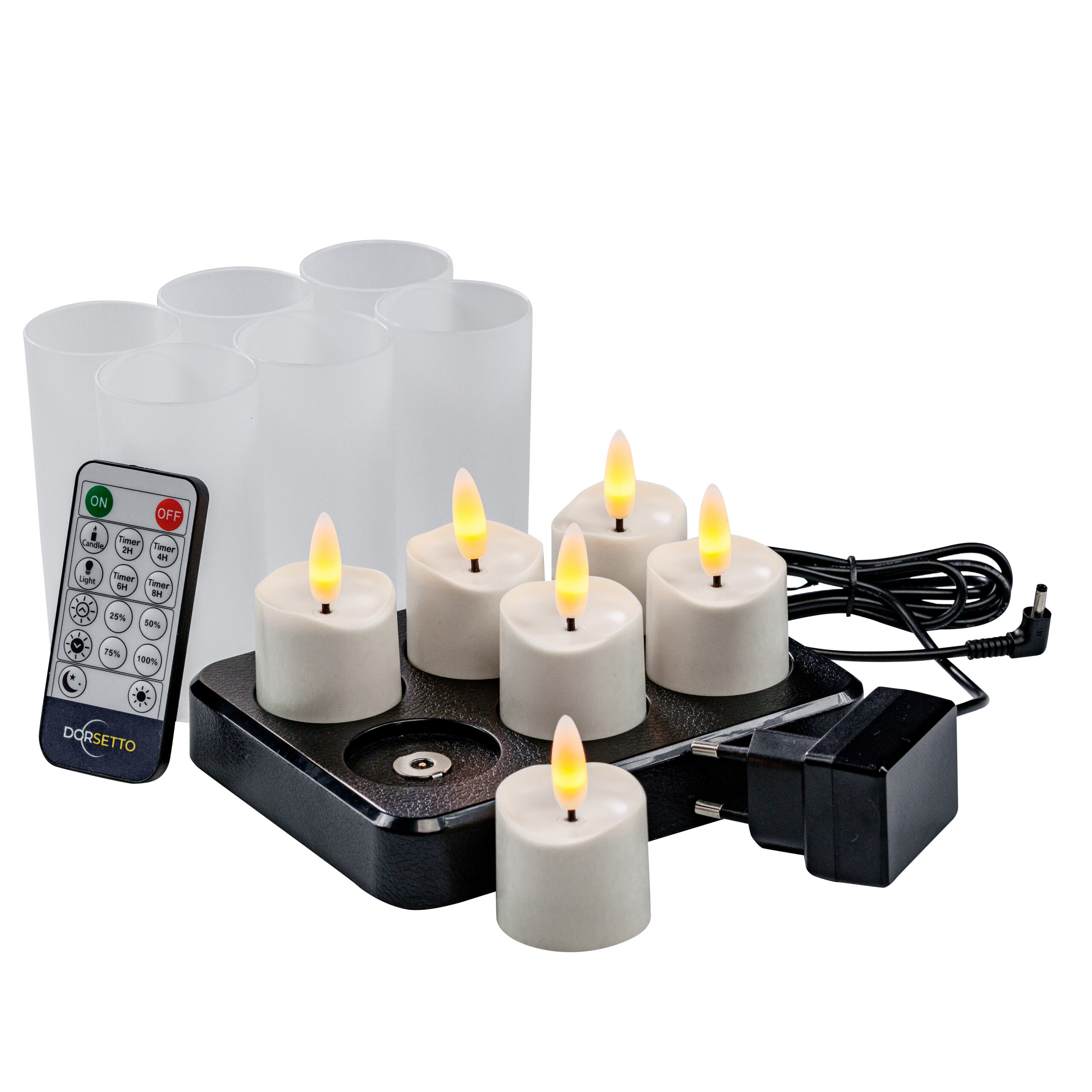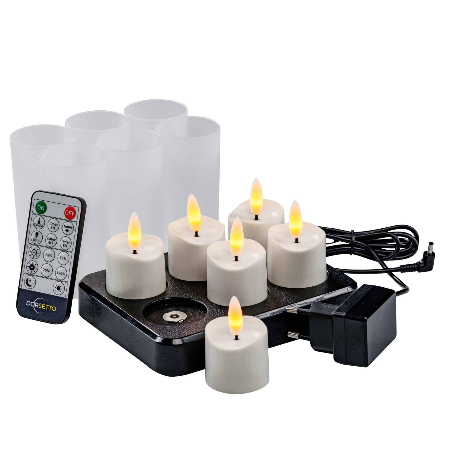 3D ładowalne LED tealighty DORSETTO – zestaw 6 sztuk z pilotem i timerem