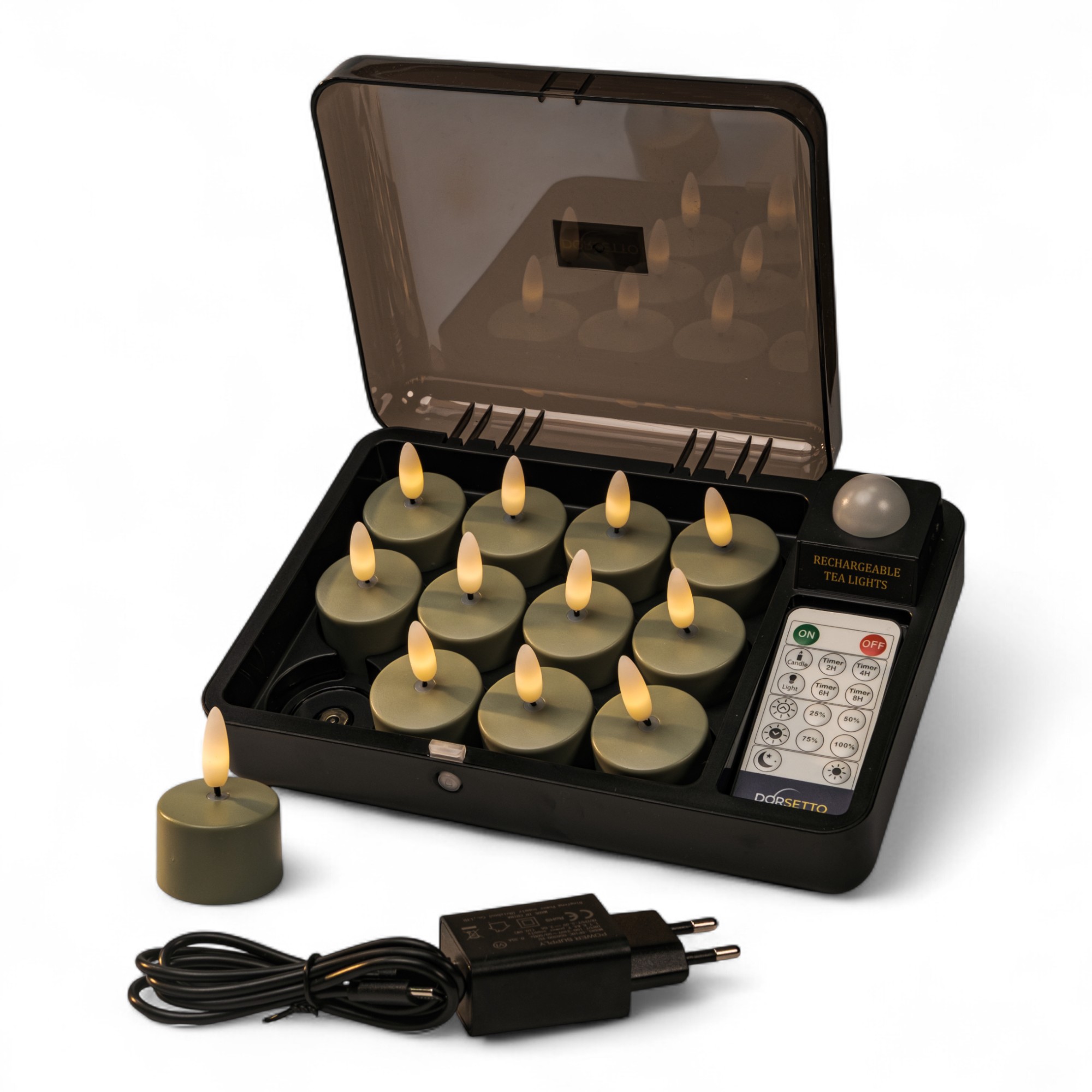 Ładowalne LED tealighty oliwkowe – do 400 godzin świecenia, 12 sztuk, z pilotem